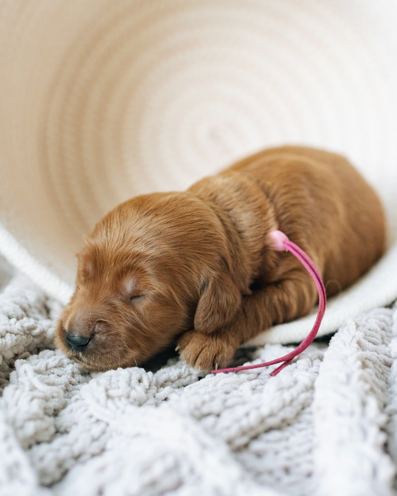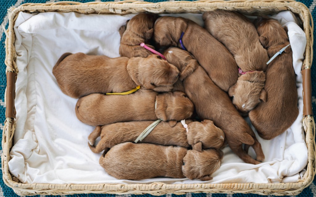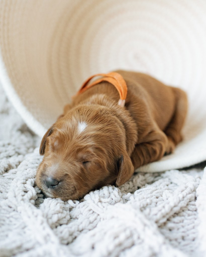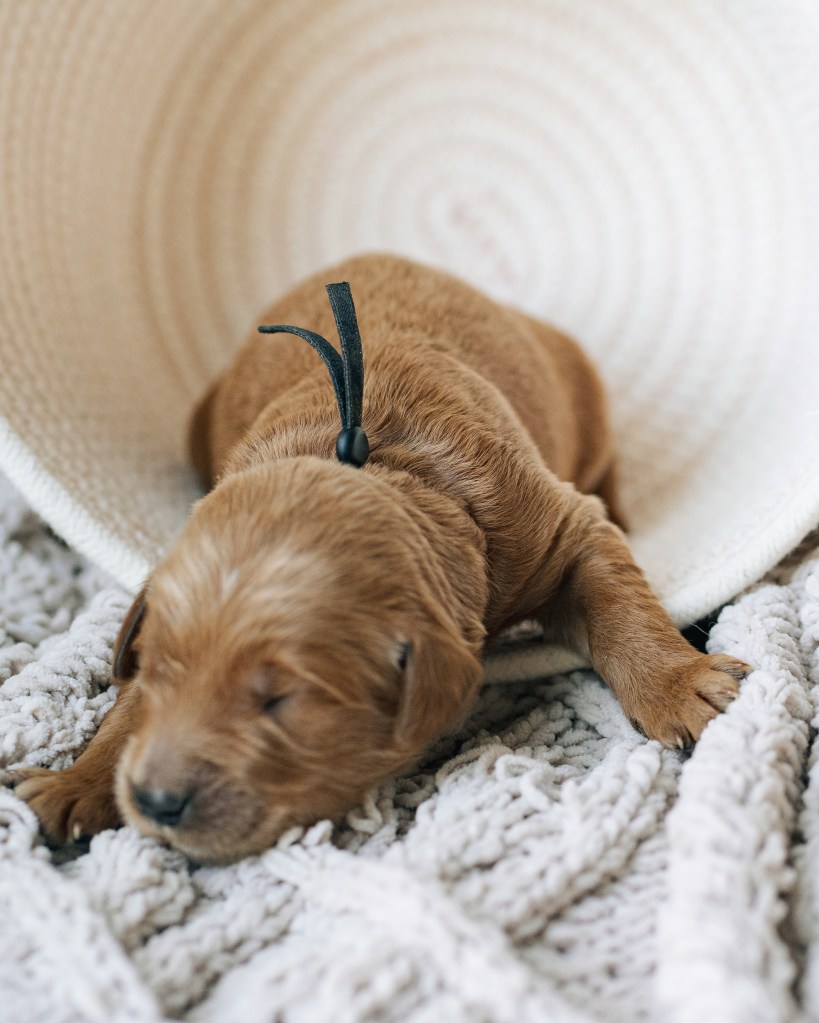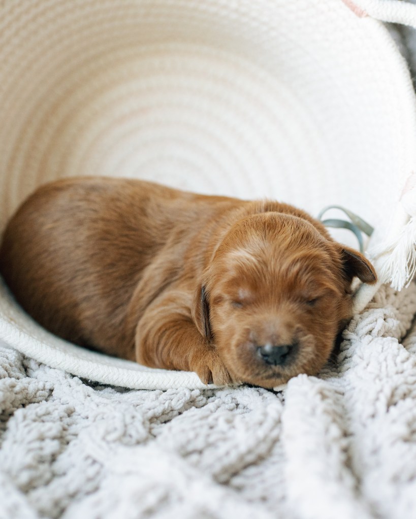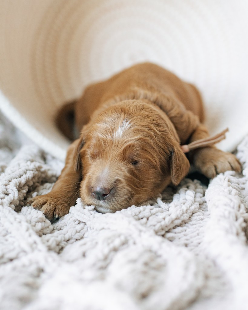 Nala is our very own Golden Retriever girl that has been raised in our home, passed all of her health testing, and was bred with our very own Theo who is a Red Standard Poodle. Puppies will be the first generation cross breed (F1 50% Red Standard Poodle and 50% Golden Retriever). Coats will be red, fully furnished, and light to non shedding.