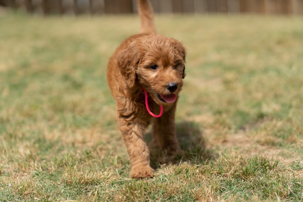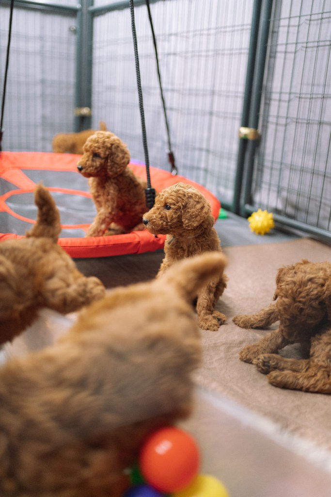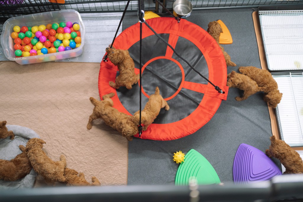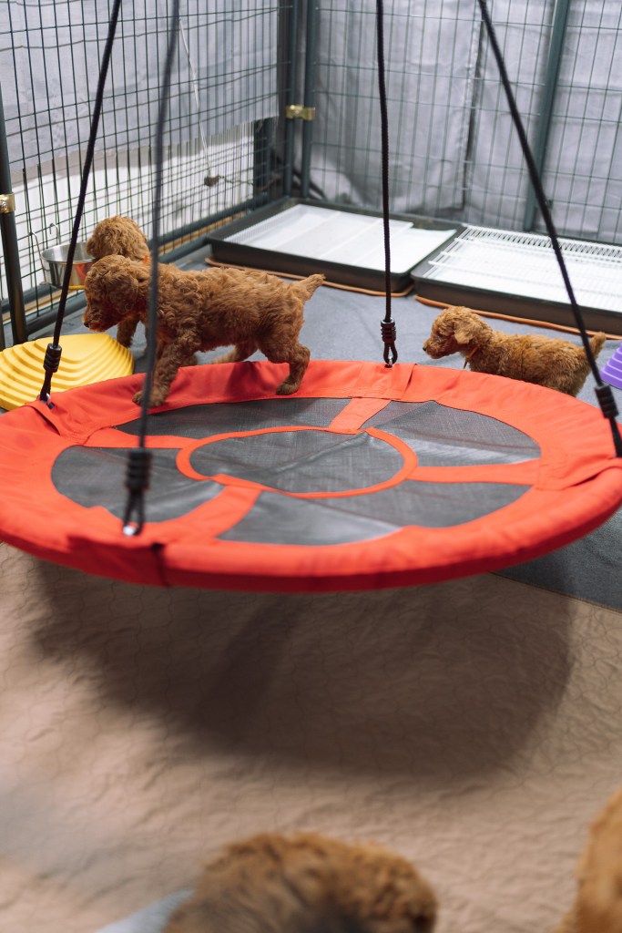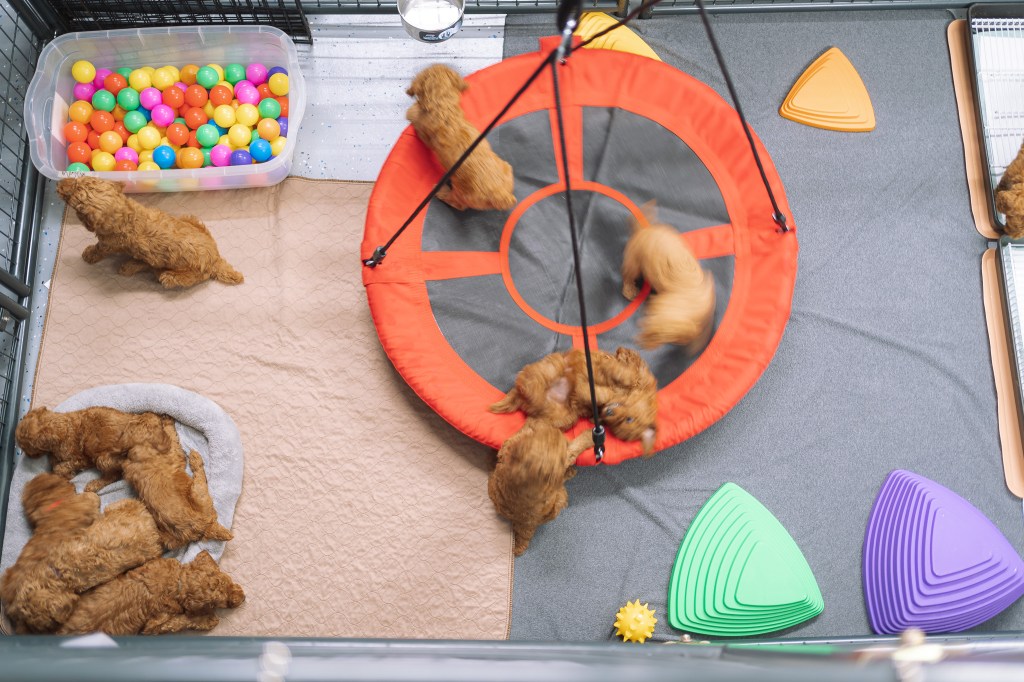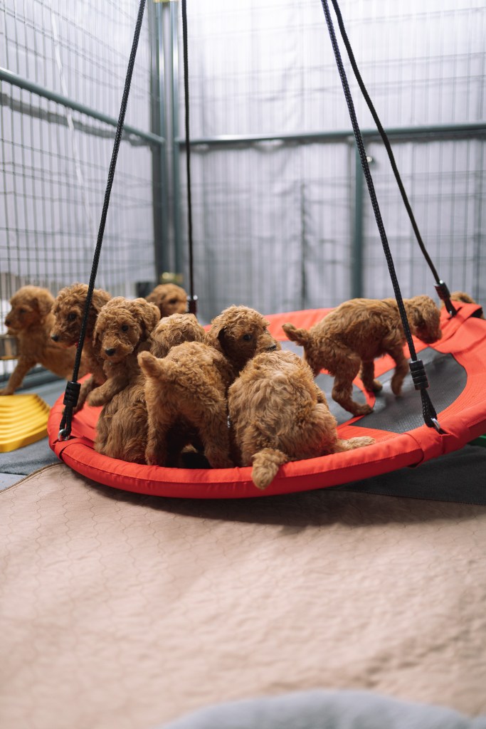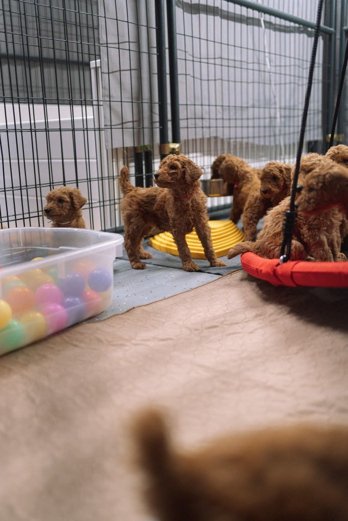 We raise our puppies in our home in our “puppy nursery” which is across from our kitchen. We have eyes on them at all times. They have a safe and controlled environment that is set up for their success and development and changes week after week so that they are getting their emotional, physical, and social needs met. We also have a beautiful fenced in yard where they get to explore and play with our older dogs as well as practice going potty outside.