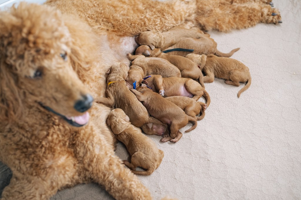 Pictured are the parents of our Red Standard Poodles. Theo is our beloved sire and Bella is our sweet mama. This is their 5th and final litter together.